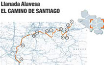El trayecto discurre a partir de este punto por la A-3112 y luego por la A-132 en dirección a Vitoria-Gasteiz; por el desvío A-4159 llegarás al Santuario de Estíbaliz (8), de indiscutible valor histórico y artístico, con elementos románicos y posteriores complementos del gótico. Ya en la capital alavesa (9) encontrarás testimonios del recorrido jacobeo, como la Capilla de Santiago, en la Catedral de Santa María, o el Convento de la Magdalena. Saliendo de la ciudad por el Paseo de la Senda alcanzarás Armentia (10), donde se encuentra la Basílica de San Prudencio, joya del románico alavés, que fuera sede episcopal en tiempos del dominio musulmán y posteriormente centro espiritual de Álava durante la Edad Media.
