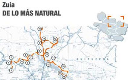 Bordeando el embalse de Ullíbarri disfrutarás de un paisaje de gran belleza, bien tomando la A-3002 hacia el pueblo de Ullíbarri Gamboa (15), bien la A-3014 hacia Marieta (16), ya en la Cuadrilla de Salvatierra. Si eliges esta segunda opción, continúa por la carretera y saldrás a la A-3012 desde donde puedes tomar el desvío de la A-4012 al Parque de Garaio (17), una auténtica "playa" dotada con todos los servicios y en la que se alquilan bicicletas. No muy lejos, encontrarás el Observatorio de Aves de Mendíjur (18).